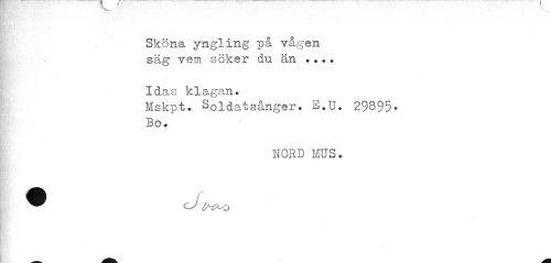 //// Sköna yngling på vågen säg vem söker du än ... //// Idas klagan. //// Mskpt. Soldatsånger. B.U. 29895-Bo. //// HORD MUS. //// ^ c/fatlo ////