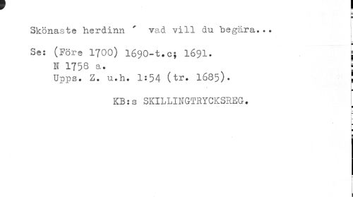 //// Skönaste herdinn ' vad vill du begära... //// | //// Se: (Före 1700) 1690-t.c; I69I. j //// N 1758 a. « //// Upps. 1. u.h. 1:54 (tr. I685). | //// ¦ //// KB:s SKILLINGTRYCKSREG. //// I //// h //// . t i ////