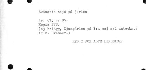 //// Skönaste nejd på jorden //// Bfr. 67, s• 85. Kopia SVS. //// (ej belägg, Djurgården på l:a maj med anteckn»: Af M. Cramaer.) //// REG T JOH ALFR LINDBÄCK. ////