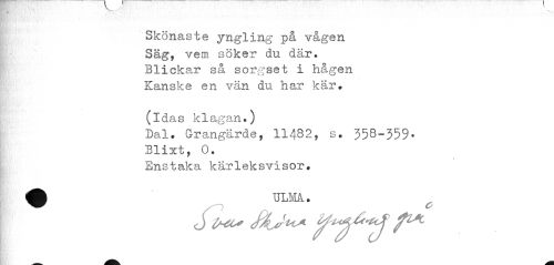 //// Skönaste yngling på vågen //// Säg, vem söker du där. Blickar så sorgset i hågen Kanske en vän du har kär» //// (Idas klagan.) //// Dal. Grangärde, 11482, s. 358-359-Blixt, 0. //// Enstaka kärleksvisor. //// SI** j%jha y^-rf f1* ////