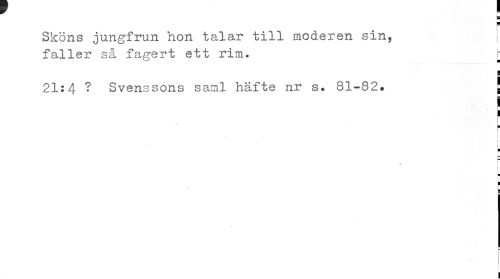 //// ¦ //// Sköns jungfrun hon talar till moderen sin, j //// faller så fagert ett rim. r //// ¦ //// 21:4 ? Svenssons saml häfte nr s. 81-82. ! //// ¦ //// i //// i ¦ //// 'j- //// • * //// i //// 2 //// i ////