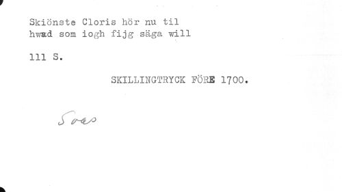 //// Skiönste Cloris hör nu til hwsd som iogh fijg säga vri.ll //// 111 S. //// SKILLINGTRYCK FÖRE 1700. //// k ////