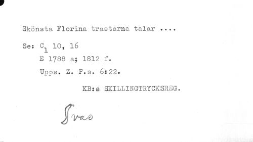 //// Skönsta Florina trastarna talar ... //// Se: C 10, 16 //// E 1738 a; 1812 f. Upps. Z. P.s. 6:22. //// KB:s SKILLINGTRYCKSREG. ////