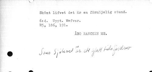 //// Skönt lifvet det är en förnöjelig stund. //// 6:4. Uppt. Wefvar. R5, 186, 191. //// Ibo rancken ms. //// # Sm ^WMrf^^'^ //// f ////
