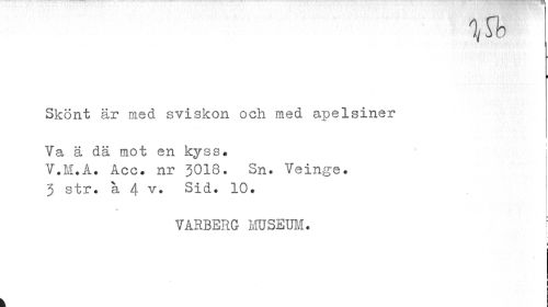 //// Ift) //// I //// Skönt är med sviskon och med apelsiner //// Va ä dä mot en kyss» //// V.M.A. Acc» nr 3018. Sn. Veinge. //// 3 str. a 4 v. Sid. 10# //// VARBSRG MUSEUM. //// i ////