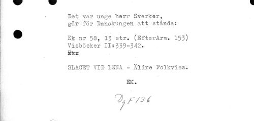//// Det var unge herr Sverker, går för Danakungen att stånda: //// ® Sk nr 58, 13 str. (EfterArv. 153) //// Visböcker 11:339-342. äkx //// » //// SLAGET VID LENA - Äldre Folkvisa. //// EK. ////