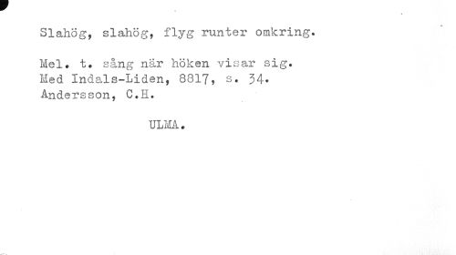 //// « //// Slahög, slahög, flyg runter omkring. //// Mel. t. sång när höken visar sig. Med Indals-Liden, 8317, s. 34. Andersson, C.H. //// ULM. ////
