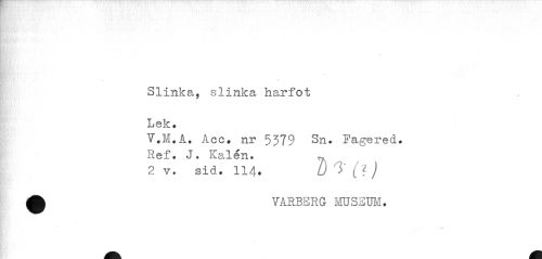 //// Slinka, slinka harfot Lek» //// V »M. A. Acc. nr 5J79 Sn. Fagered. Ref. J. Kalén. //// 2 v. sid. 114. U °> ( ? ) //// ^ VARBERG MUSEUM. ////