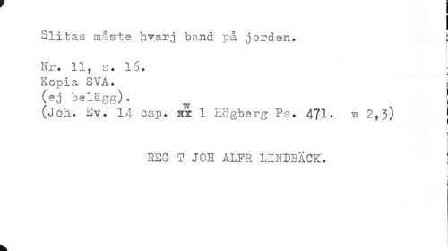 //// ! //// Slitas måste hvarj band på jorden* //// ... //// ¦ //// Nr. 11, s. 16. ; //// Kopia SVA. j //// (ej belägg). | //// (Joh. Ev. 14 cap. xx 1 Högberg Ps. 471* w 2,3) ' //// 1 ¦ //// v- //// REG T JOH ÅLPR LINDBÄCK. ; //// 1 //// i //// t ////