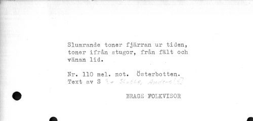 //// Slumrande toner fjärran ur tiden, toner ifrån stugor, från fält och vänan lid. //// Hr. 110 mel. not. Österbotten. //// I //// Text av S ~ StoiLe, ifj //// £ BRAGS FOLKVISOR ////