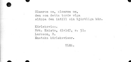 //// Slumrom om, slomrom om, //// den som detta, torde våga //// släppa den intill sin hjärtliga kär. //// Kärleksvisa. //// Nrk. Knista, 41:147, s. 51. //// Larsson, R. //// Enstaka kärleksvisor. //// ULM. ////