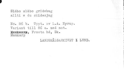 //// ¦ //// Släbo släbo grödebug \ //// allti e du skidesjug ! //// i //// Ho. 86 b. Uppt. av L.A. Nyrup. //// Variant till 86 a. med not. j //// StaafcsEÄxp, Frosta hd, Sk. ' //// Munkarp ; //// LANDSMÅLS ARK I VET I LUND. //// > //// i //// | //// I //// 4 //// I ////