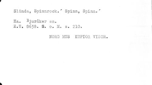 //// Slända, Spinnrock. ' Spinn, Spinn. ' //// Ha. Bjuråker sn. //// E.U. 3638. S. o. M. s. 210. //// NORD MUS KOPIOR VISOR. //// k ////