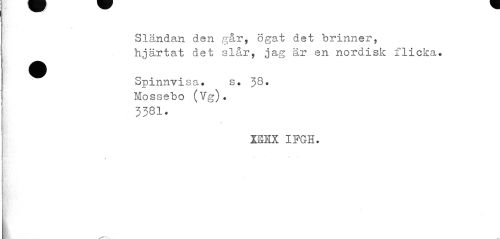 //// Sländan den går, ögat det brinner, hjärtat det slår, jag är en nordisk flicka. //// ^^ Spinnvisa. s. J8. //// Mossebo (Vg). 3381. //// XSHX IFGH. //// u •• r ////