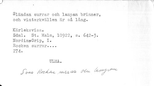 //// I //// Sländan surrar och lampan brinner, och vinterkvällen är så lång. //// Kärleksvisa. //// Sdrnl• St. Malm, 10922, s. 642-3. ITordin^Grip, I. Rocken surrar... //// 274. //// ULMA. ////