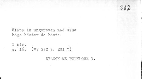 //// Wk //// ¦ //// * //// Släpp in ungersven med sina höga hästa,r de bästa //// 1 str. //// s. 16. (Vs 2:2 s. 281 ?) //// DYBECK MS FOLKLORE 1. //// | ////