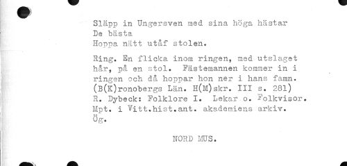//// å I //// Släpp in Ungersven med sina höga hästar De bästa //// Hoppa nätt utåf stolen. //// * //// Ring. En flicka inom ringen, med utslaget hår, på en stol. Fästemannen kommer in i ringen och då hop-par hon ner i hans famn. (B(K)ronobergs Län. H(M)skr. III s. 28l) R. Dybeck: Folklore I. Lekar o. folkvisor. Mpt. i Vitt.hist.ant. akademiens arkiv. Ög. //// NORD MUS. 7/ ////