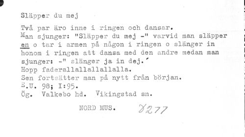 //// c //// Släpper du mej j //// i //// Två par äro inne i ringen och dansar. \ //// ^an sjunger: "Släpper du mej -M varvid man släpper j en o tar i armen på någon i ringen o slänger in i //// honom i ringen att dansa med den andre medan man j //// sjunger: -M slänger ja in dej.' I //// Hopp faderallallallallalla. j //// Sen fortsätter man på nytt från "början. //// E.U. 98; 1:95» //// Ög. Valkebo hd. Vikingstad sn. //// NORD MUS. 7/ //// i //// ! ////