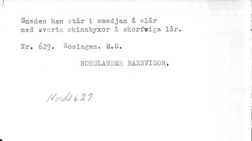 //// Smeden han står i smedjan å slår ¦ //// med svarta skinnbyxor å skorfViga lår. //// i i //// Hr. 629. Roslagen. E.S. //// NORDLANDER BARNVISOR. i //// ' ... I //// ! //// ! j ////