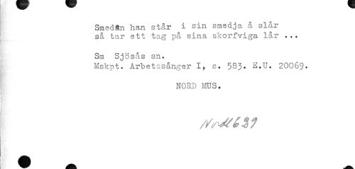 //// Smedftn han står i sin smedja å slår så tar ett tag på sina skorfviga lår ••. //// Sm Sjösås sn. //// Mskpt. Arbetssånger I, s. 583. E.U. 20069. //// NORD MS. ////