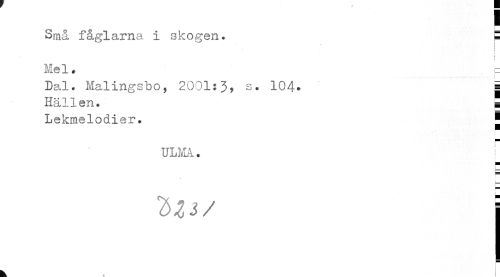 //// I //// Små fåglarna i skogen. p //// i i //// i //// I //// • i Mel ? p //// Dal. Malingsbo, 2001:3* s. 104» g //// Hällen. ¦ //// Lekmelodier. J //// ULMA. j //// zzj/ | //// k ////