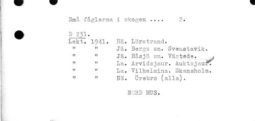 //// Små fåglarna i skogen ... 2. //// ^^ Lekt". 1941» Hä# Lörstrand. //// n !! Jä* Bergs sn. Svenstavik. //// 11 n Jä. Håsjö sn. Västede. ; //// tf n La. Arvidsjaur. AuktsjaufT //// ft " La. Vilhelmina. Skansholm. //// ft Nä. Örebro (alla). //// NORD MUS. //// > ////