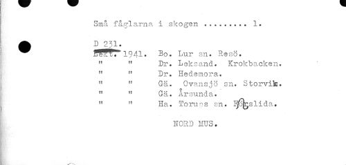 //// Små fåglarna i skogen ... 1. //// ^^ flfirr 1941. Bo. Lur sn. Resö. //// 11 M Dr. Leksand. Krokbacken, //// rt rf Dr. Hedemora. //// " n Gä. Ovansjö sn. Storvik. //// fl " Gä. Ar sund a. //// lt " Ha. Toruos sn. E)(S^slida» //// NORD MUS. ////