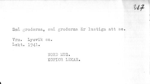 //// ut //// I //// Små grodorna, små grodorna är lustiga att se» //// Vrm.. Lysvik sn. Lekt. 1941. //// NORD MUS. //// KOPIOR LEKAR. j ////