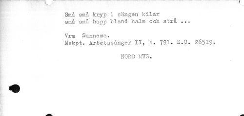 //// äp.vc //// Små små kryp i sängen kilar små små hopp "bland halm och strå //// Vrm Sunnemo. //// Mskpt. Arbetssånger II, s. 791. E.U. 26519• //// HORD MUS. ////