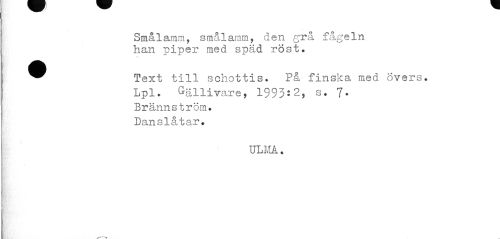 //// Smålamm, smålamm, den grå fågeln han piper med späd röst. //// ^^ Text till schottis. På finska med Övers. //// Lpl. Gällivare, 1993*2, s* 7• Brännström. Danslåtar. //// ULMA. ////
