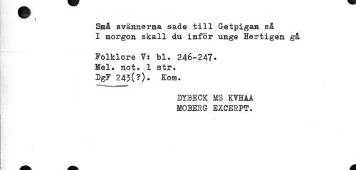 //// Små svännema sade till Getpigan så I morgon skall du inför unge Hertigen gå //// Folklore 7: bl. 246-247* Mel» not. 1 str. //// DgF 243(?)• Kom. //// DYBECK MS KVHAA //// MOBERG EXGERPT. //// i ////