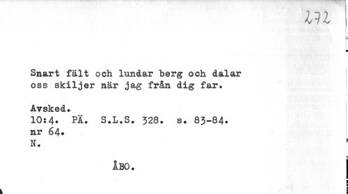 //// Ill //// Smart fält och lundar berg och dalar oss skiljer när jag från dig far. //// Avsked. //// 10:4. PÄ. S.L.S. 328. s. 83-84. nr 64. //// N. //// i //// ÅBO. //// ¦ ////