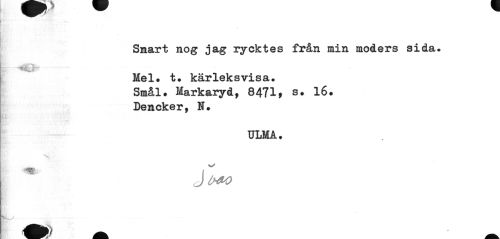 //// Smart nog jag rycktes från min moders sida. //// v > //// Mel. t. kärleksvisa, //// Smål. Markaryd, 8471 > s. 16. //// Dencker, II. //// ULMA. //// i //// fk^J ...• ////