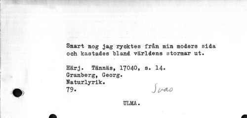 //// Smart nog jag rycktes från min moders sida och kastades bland världens stormar ut» //// Härj. Tännäs, I704O, s. 14. //// Granberg, Georg. Naturlyrik. //// •() 79 • j //// ¦ 'j //// ULMA. ////