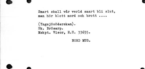 //// Smart skall vår verlå snart bli slut, man hör blott mord och brott //// (Yngsjomöderskan)• Sk* BrÖsarp» //// Mskpt. Visor, E.U. 33655» //// NORD MUS» ////