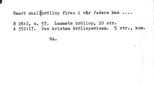 //// « //// Snart skalljbröllop firas i vår faders hus //// B 28:2, s. 57. Lammets bröllop, 10 str. A 352:17. Den kristna bröllopsvisan* 5 str., kom. //// RA* ////