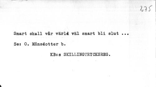 //// llf //// f- //// : i //// \ I i //// » « //// Smart skall vår värld väl smart bli slut ••* //// ¦ - • -...' ¦ ¦ i //// i //// Se: O» Månsdotter b. //// i //// KB:8 SKILLINGTRYCKSREG. ////