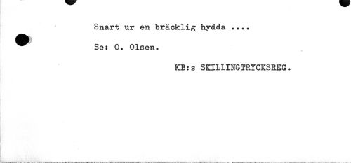 //// Snart mr en bräcklig hydda • •.. ^^ Se: O. Oisen. //// i //// KBjs skillingtrycksreg. //// ---t-r-w---. ¦¦ . - — v^^-.-W*,-—___ . ^.T*-»--y- ___.___ ___. .. - ..._ . ___r—___..._ . ___ . ...• ////