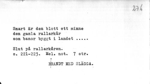 //// Snart är den blott ett minne //// den gamla rallarkår | //// som banor byggt i landet ... //// i //// i i //// Slut på rallarkåren. //// s. 221-223. Mel. not. 7 str. //// t //// BRANDT MSD SLÄGGA. //// I ////