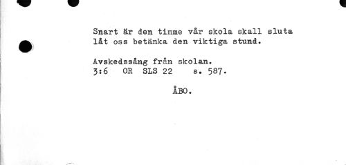 //// Smart är den timme vår skola skall sluta //// •låt oss betänka den viktiga stund. //// ff //// Avskedssång från skolan. 5:6 OR SLS 22 s. 587» //// ÅBO. //// 4 ////