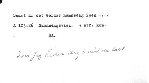 //// Snart är det Gerdas namnsdag igen . A 103:26 Hamnsdagsvisa» 3 str. kom. //// r //// HA. //// JU, fe**» 1 ^ ////