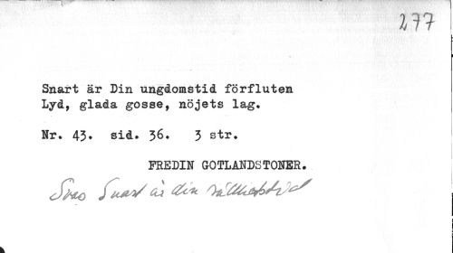 //// m //// Snart är Din ungdomstid förfluten Lyd, glada gosse, nöjets lag. //// Mr. 43* sid* 56. 3 str. //// FREDIN GOTLANDSTOHER. //// ¦ ¦ //// i //// i ¦ //// k ////