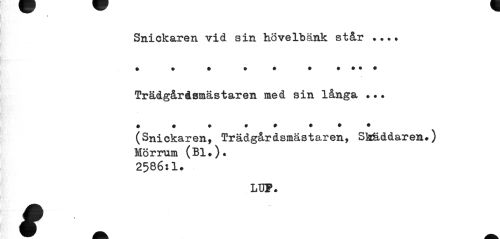//// Snickaren vid sin hovelbänk står . ..* ? . • » . . • • • • //// Trädgårdsmästaren med sin långa •.• • . ? . . • ? • //// (Snickaren, Trädgårdsmästaren, Steiddaren.) Mörrum (Bl.)* 2586:1. //// LUF. ////