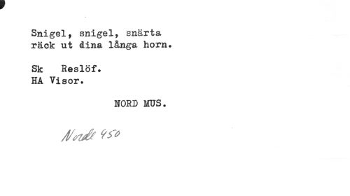 //// Snigel, snigel, snärta räck ut dina långa horn. //// Sk Reslöf. HA Visor. //// NORD MUS. ////