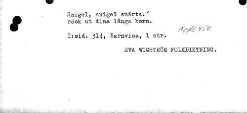 //// Ä Snigel, snigel snärta.' //// räck ut dina långa horn. //// W /tfoU 9>o //// I:sid. 314» Barnvisa, 1 str. //// EVA WIÖSTRÖM FOLKDIKTNING. //// ¦Élkr.^---, ^ É___ ...___ . ___ _ . ___wmmimm^ ___„__—-- ////