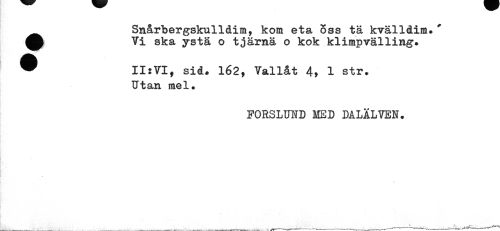 //// •Snårbergskulldim, kom eta oss tä kvälldim»* Vi ska ystä o tjärnä o kok klimpvälling* //// ® II:VI, sid* 162, Vallåt 4> 1 str. //// Utan mel» //// FORSLUND MED DALÄLVEN. ////
