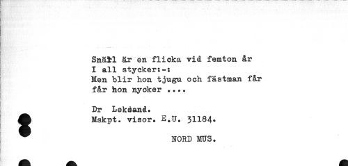 //// Snäil är en flicka vid femton år I all stycken-: //// Men blir hon tjugu och fästman får får hon nycker •. ? ? //// Dr Lekåand. åk Mskpt* visor* S.U. 31184* //// NORD MUS* ////