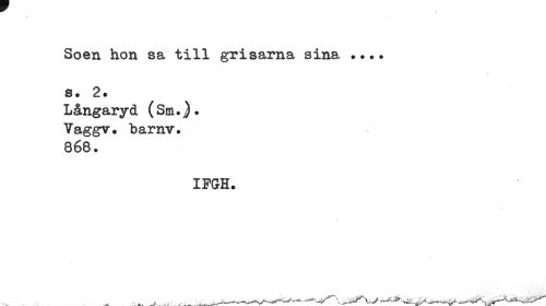 //// Soen hon sa till grisarna sina •••• s * 2. //// Långaryd (Sm.). Vaggv. harnv. 868. //// IFGH. //// x -- ////