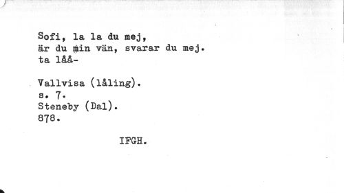 //// Sofi, la la du mej, //// är du ©in vän, svarar du mej. //// ta 1åå~ //// . Vallvisa (låling). s» 7* //// Steneby (Bal). 878. //// IFGH. ////