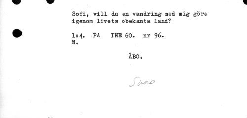 //// Sofi, vill du en vandring med mig göra igenom livets obekanta land? //// ^ 1:4. PA INE 60. nr 96. //// K. //// ÅBO. //// J ////